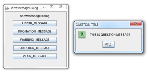- JOptionPane.showMessageDialog(null,"THIS IS QUESTION MESSAGE","QUESTION TITLE",JOptionPane.QUESTION_MESSAGE);